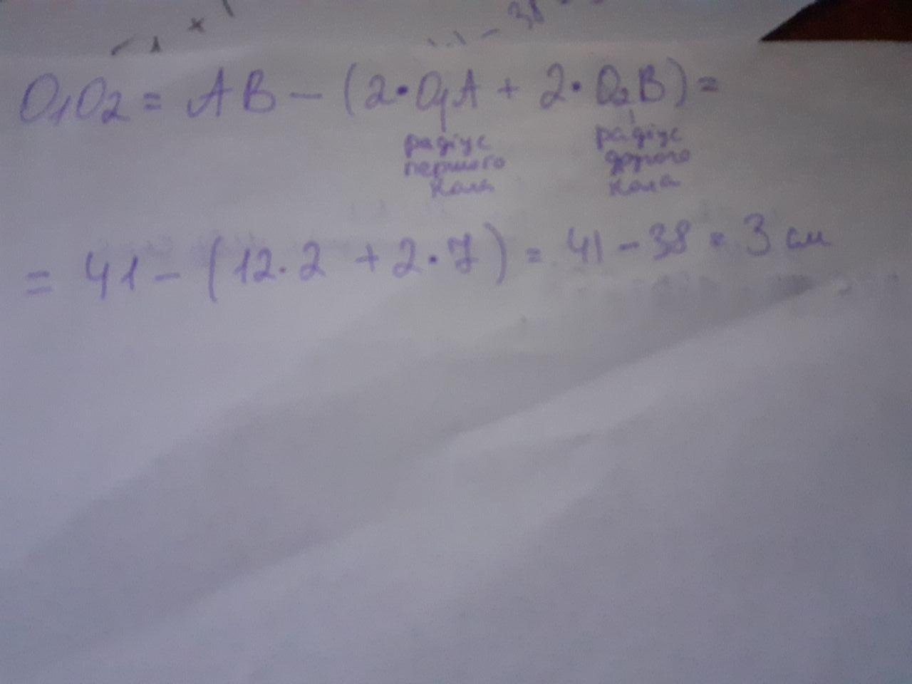 чтобы найти отрезок О1 О2 нам нужно найти диаметр о1 это 24 потому что 12 нужно умножитьна на 2. o2 диаметр является 14 то есть 7 х 2 Затем нужно плюсовать 14 и 24.получается 38 Но нам нужно найти этот самый маленький промежуток между окружностями чтобы его найти нужно от 41 отнять 38. получается 3. Это сумма является этим самым маленьким промежутком чтобы найти расстояние между о1 и О2 нужно 12 + 7 + 3. 12- это радиус окружности о1. A 7 это радиус окружности o2. 3 тот самый маленький промежуток. ОТВЕТ:23