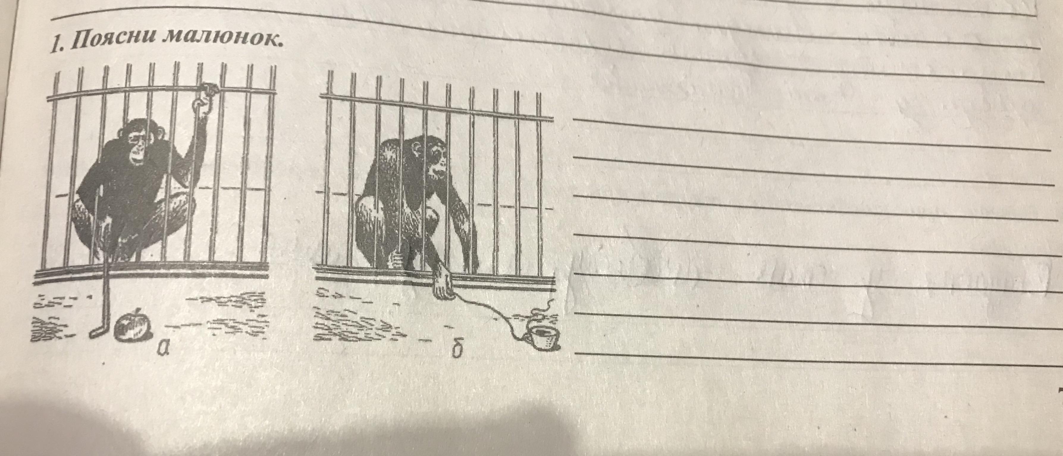 На малюнку а) зображена мавпа в клітці,яка не дістає до яблука через те, що знаходиться в клітці і за допомогою палиці дістає собі яблуко,а на малюнку б) зображена мавпа,яке дістає собі швидше за все склянку води