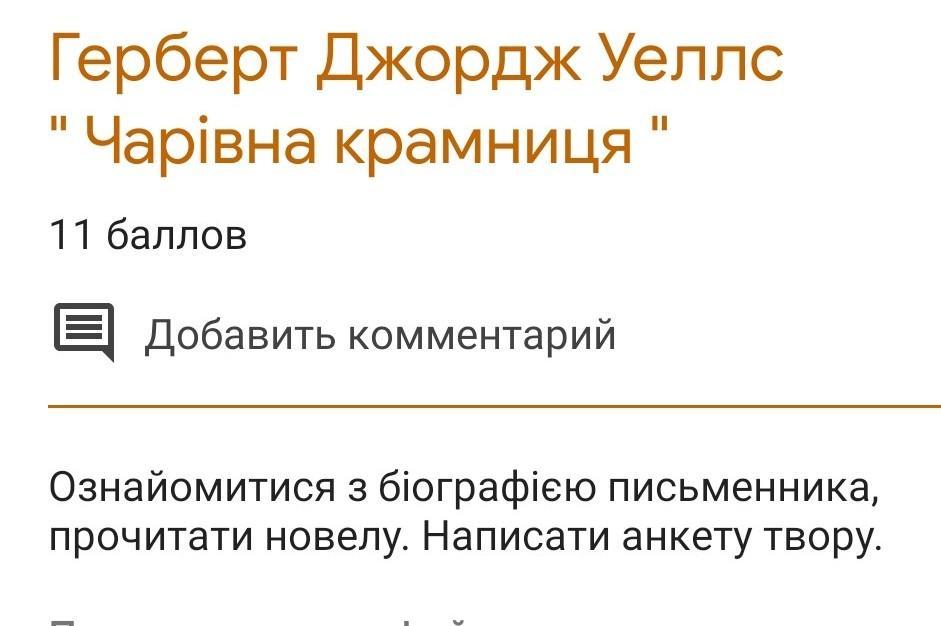 Автор – Г.Дж. Уеллс Рік написання – 1903 Жанр – фантастична новела Головні герої: хлопчик Джип, його батько, торговець-чарівник, розбещений хлопчик Едуард Тема: відвідини батьком та сином чарівної крамниці; незвичайні подарунки для Джипа Ідея: Лише ті люди котрі вміють мріяти і фантазувати можуть побачити чари і відкрити для себе світ фантастичного і цікавого. Основна думка – твір уславлює людяність, добро, вчить бачити прекрасне у світі, закликає вірити в дива, мріяти та думати про краще майбутнє, наближати його своїми добрими справами Композиція “Чарівна крамниця” Експозиція – крамниця-міраж Зав’язка – біля вітрини Джип та батько Розвиток дії – Огляд чарівних речей. Фокуси продавця. Марні спроби розбещеного хлопчика. Товари для Джипа. Огляд виставки. Кульмінація – Зникнення хлопчика Розв’язка – Диво для Джипа продовжується вдома, батькові ж воно недоступне Сюжет “Чарівна крамниця” Хлопчик на ім’я Джин разом із батьком, від особи якого в новелі ведеться розповідь, потрапляють у крамннчку де продають дитячі іграшки. А крамниця виявилася незвичайною: одразу за її порогом почалися дива. Крамниця була заповнена чарівпими речами. Тут був тигр із пап’є-маше, який розмірено киває головою, кришталеві кульки, “порцелянова рука з колодою чарівних карт” і багато інших чарівних речей. На підлозі стояло кілька чарівних дзеркал, які звужували й видовжували, приплющували голови й скрадали ноги. Та справжні дива почалися, коли з’явився продавець. Він почав діставати кришталеві кульки зі своєї голови та кишені хлопчика. З-під пальців продавця сипали різнобарвні іскри, шворку він дістав зі свого рота, а палець, якого продавець потримав над вогнем, обернувся на паличку червоного сургучу. Продавець знав не тільки те, що хотів би придбати собі Джип, йому відомо було навіть ім’я хлопчика та його домашня адреса. Батько Джипа раптом виявив у своєму капелюсі скуйовджепого голуба, два чи три яйця, мармурову кульку, годинника, чималу кипу паперу. Прилавок раптом витягнувся й загородив дорогу до дверей. До крамниці хотів зайти розбещений хлопчик Едвард, але для неслухняних дітей крамниця була завжди зачиненою. Продавець для Джипа і його батька влаштував огляд товарів і заявив: “Всі товари в нас одного гатунку, а саме: найвищого! Нічого, крім справжньої магії! З гарантією!” Були тут і чарівні поїзди, що рухалися без пари й пружини і олив’яні солдатики, що оживали від скоромовки, проказаної над ними і чарівний меч, і чарівний коник-гойдалка… Продавець, пояснюючи, як влаштовані іграшки показував їх навиворіт. Внаслідок чергового фокусу дивакуватого торговця Джин раптом безслідно зникає з батьківського поля зору а потім так же несподівано з’являється вже за межами крамнички, де опиняється й ошелешений батько. При цьому сама зловісна крамничка, як примара, раптово зникає.. Дива скінчилися, але Джин тримав в руках чотири пакунки, очі його сяяли. Вдома з’ясувалося, що в трьох пакунках були солдатнки, а в четвертому – живе кошеня. Хлопчик залюбки грався солдатиками, які, за його словами, оживали, коли він відкривав коробку й промовляв чарівне слово. Батько багато разів пробував, коли Джин грався з ними, зненацька увійти до нього в кімнату. Але нічого чарівного він так і не помітив, для нього вони були звичайнісінькими солдатиками. Кілька разів батьк