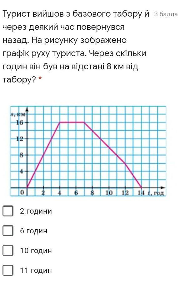 Ответ: через 2 год після виходу турист був на відстані 8 км від табору;