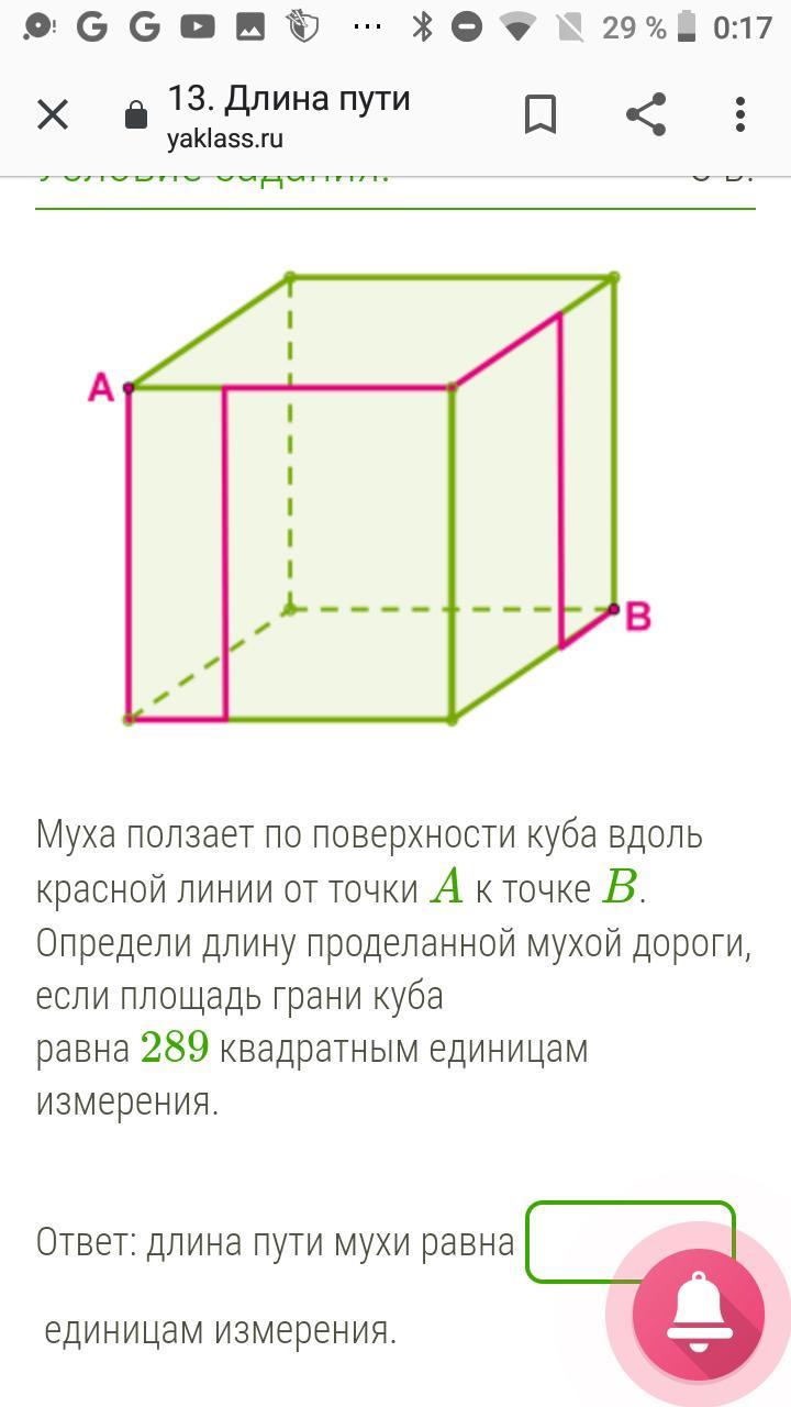 Определи длину проделанной мухой дороги, если площадь грани куба равна 289 квадратным единицам измерения.