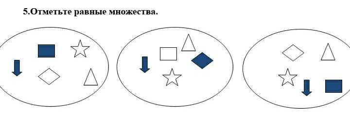 Равные множества на 1 и 3 рисунке . Там совпадение элементов синий прямоугольник ,звезда,ромб,треугольник, стрелка.