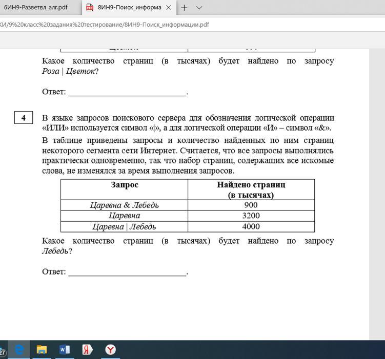 из самого нижнего запроса Царевна ИЛИ Лебедь (4000) необходимо вычесть запрос Царевна (3200) (т.к., разумеется, что при поиске Лебедь, страницы с поиском Царевна не будут нам выданы):