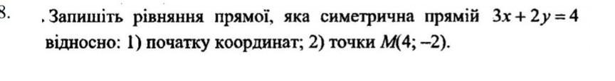 Запишите уравнение прямой, которая симметричная прямой 3х+2у=4 относительно: 1) начала координат; 2) точки М(4;-2).