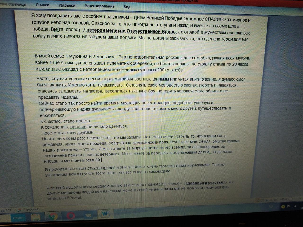 Я хочу поздравить вас с особым праздником – Днём Великой Победы! Огромное СПАСИБО за мирное и голубое небо над головой. Спасибо за то, что никогда не отступали назад и вместе со всеми шли к победе. Вы(гл. слово) ,\ ветеран Великой Отечественной Войны \, с отвагой и мужеством прошли всю войну и никто никогда не забудем ваши подвиги. Мы не должны забывать то, что сделали герои для нас.