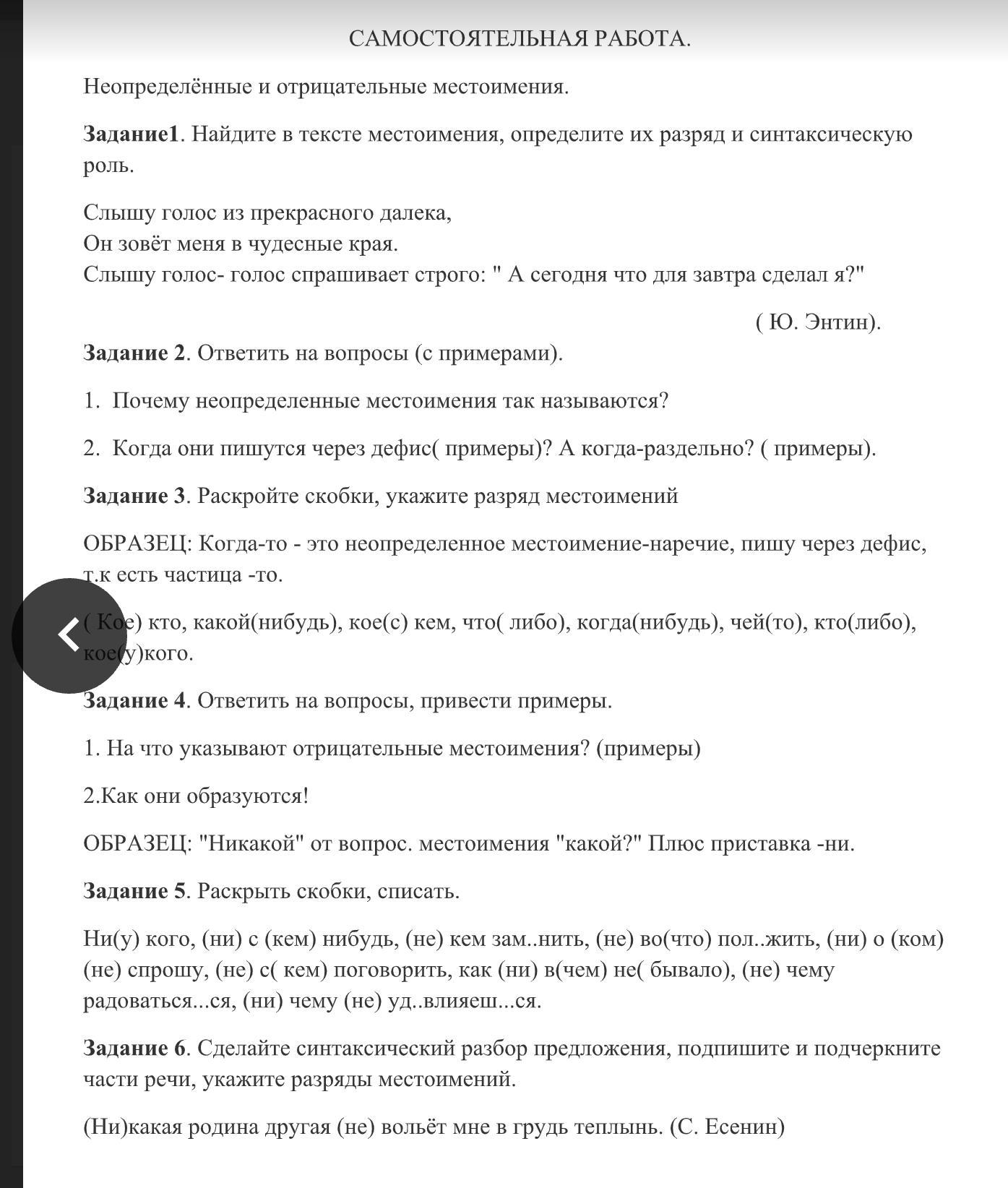 1.Отрицательные местоимения — это местоимения, которые указывают на отсутствие лиц, предметов, признаков или количества. Пример: «Никого не будет в доме». «Никакие доводы на него не действовали». «Нигде не найти правду»