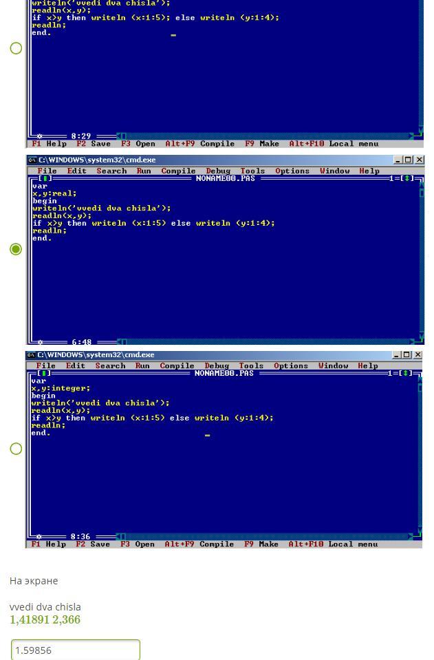 правильный ответ второй, который выбран, потому что integer не может быть применен к числам с запятой, так что подходит программа только с типом переменных real