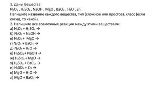 2. а) N₂O₅ + H₂SO₄ → реакция не идет (кислотные оксиды и кислоты не реагируют друг с другом)