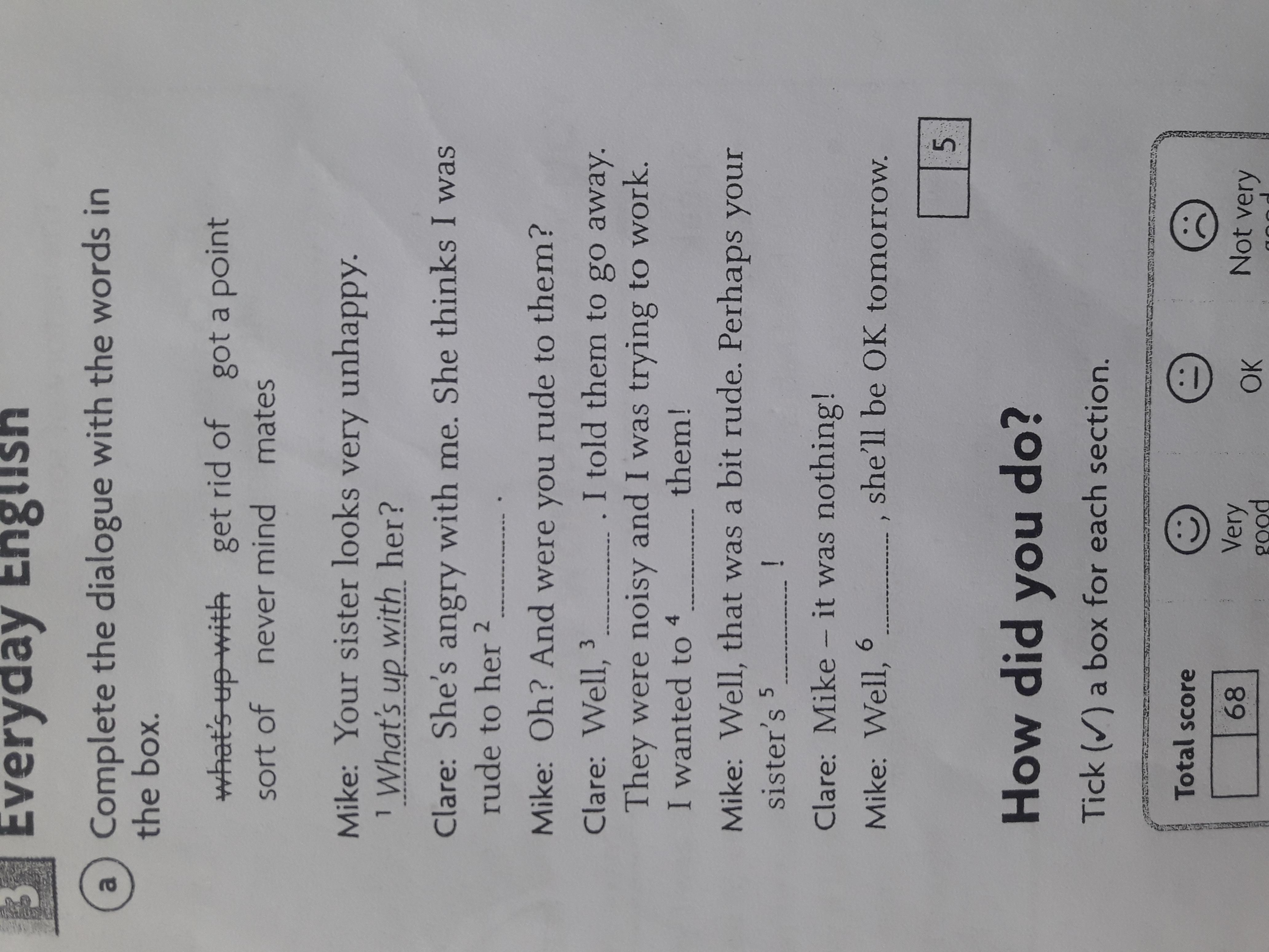 2) mates 3) never mind 4) get rid of 5) got a point 6) sort of