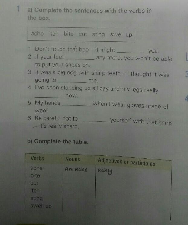 1.Sting; 2.Swelled up; 3. Bite; 4.Aching; 5.Itch; 6. Cut.