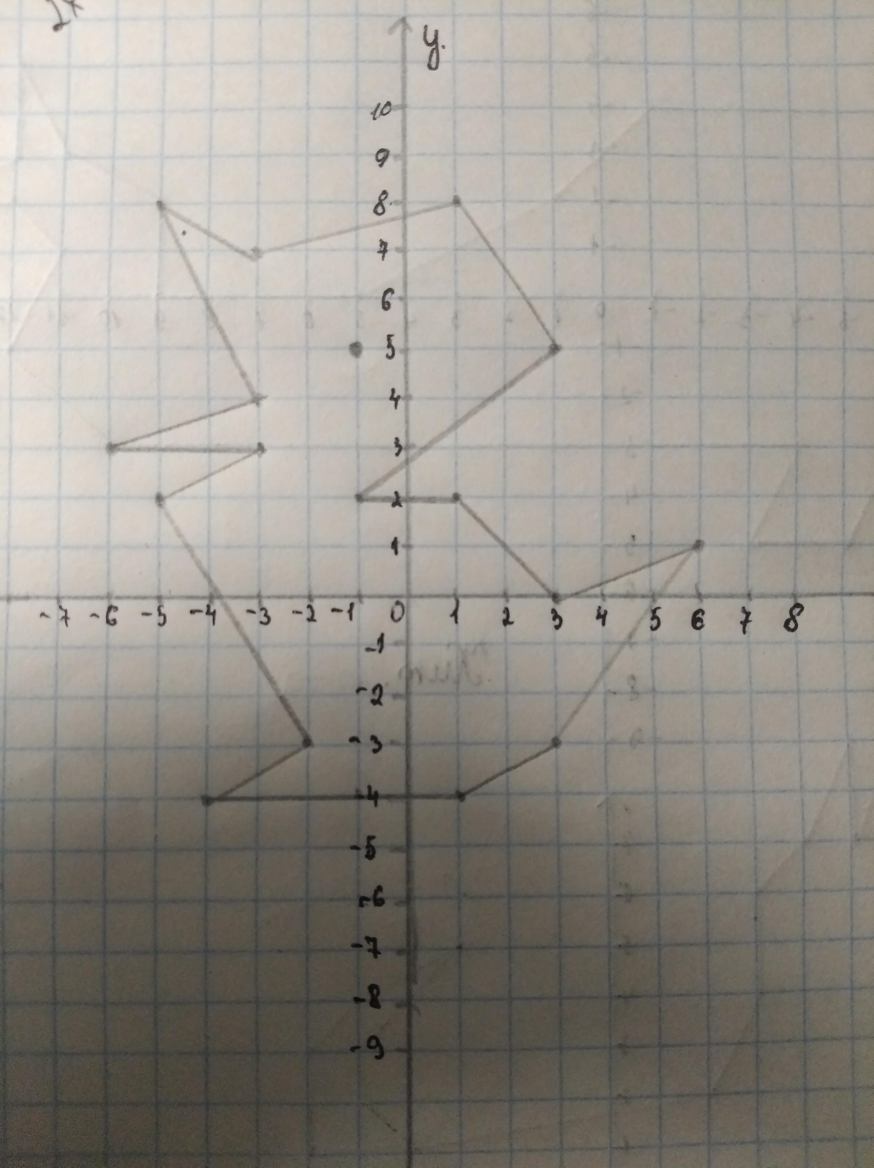 Последовательно соединяем точки, написанные ниже, между собой с помощью линейки. 1) отмечаем тоски с координатами (3;0) и (1;2), соединяем их между собой линией. 2) отмечаем точку с координатой (-1;2) и соединяем линией с предыдущей точкой и т.д. 3) И так соединяем все точки. (3;0). (1;2), (-1;2), (3;5), (1;8), (-3;7), (-5;8), (-3;4), (-6;3), (-3;3), (-5;2), (-5;2), (-2;-3), (-4;-4), (1;-4), (3;-3), (6;1), (3;0) и (-1;5).