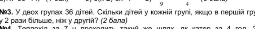 У двох групах 36 дітей. Скільки дітей у кожній групі, якщо у перші групі у 2 раза більше дітей.