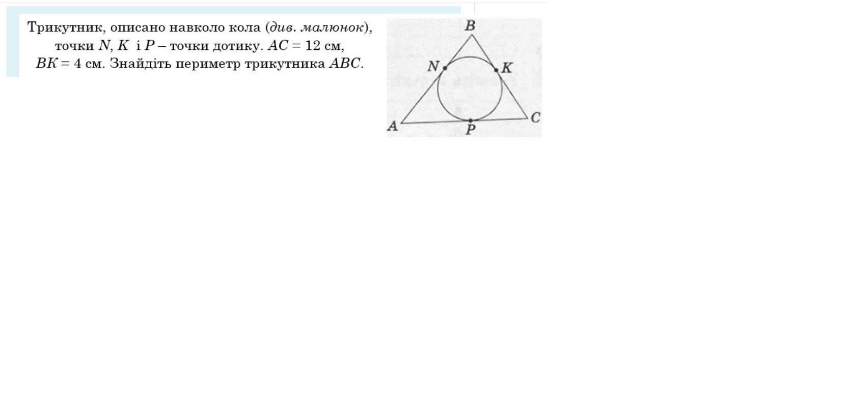 Треугольник описано вокруг круга, точки N,K и P - точки соприкасания, АС=12см, ВК=4 см, найти периметр треугольника АВС (см рисунок)