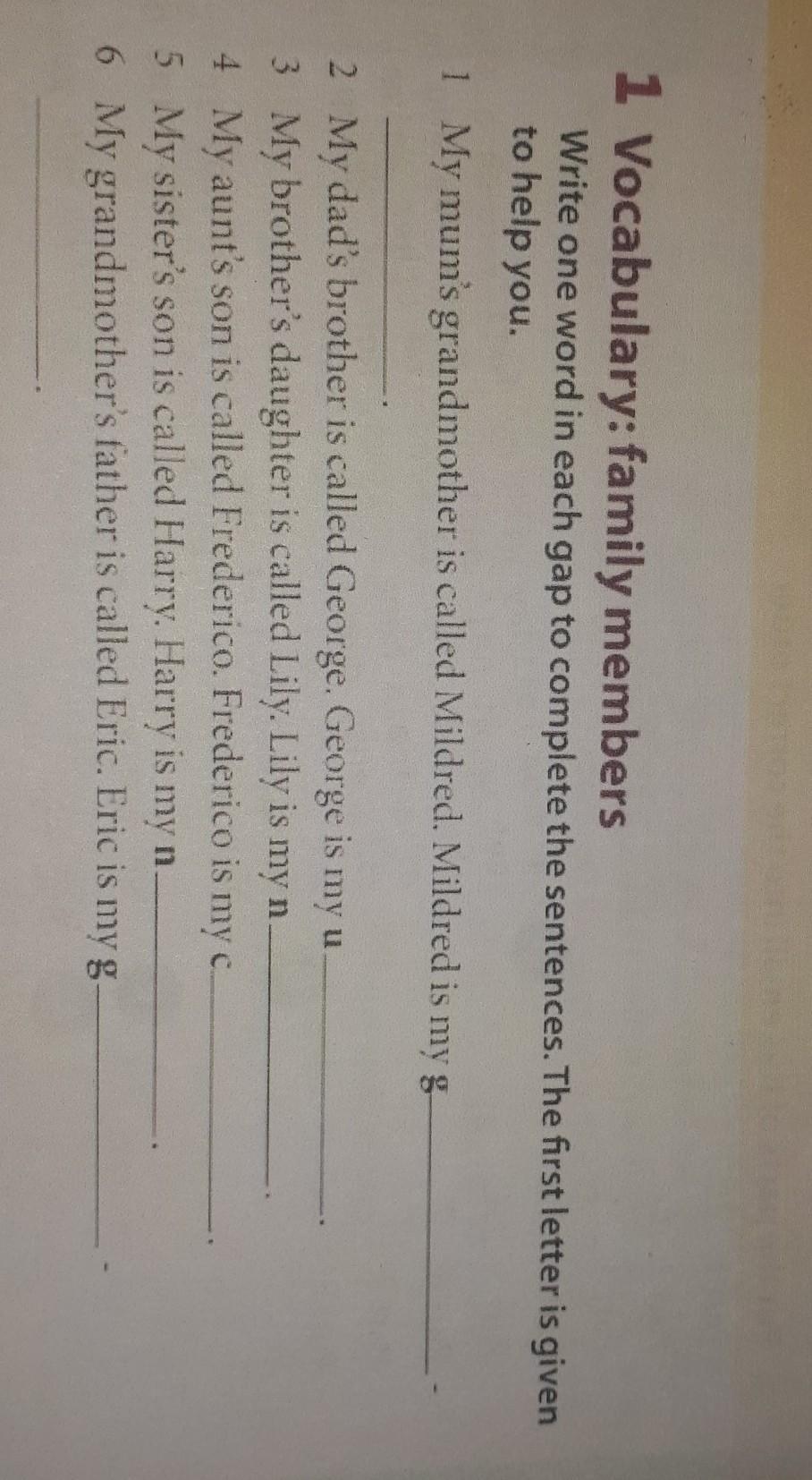 Vocabulary: family members Write one word in each gap to complete the sentences. The first letter is given to help you.помагите пожалуйста сечас надо кто не сможет не пишите фигню