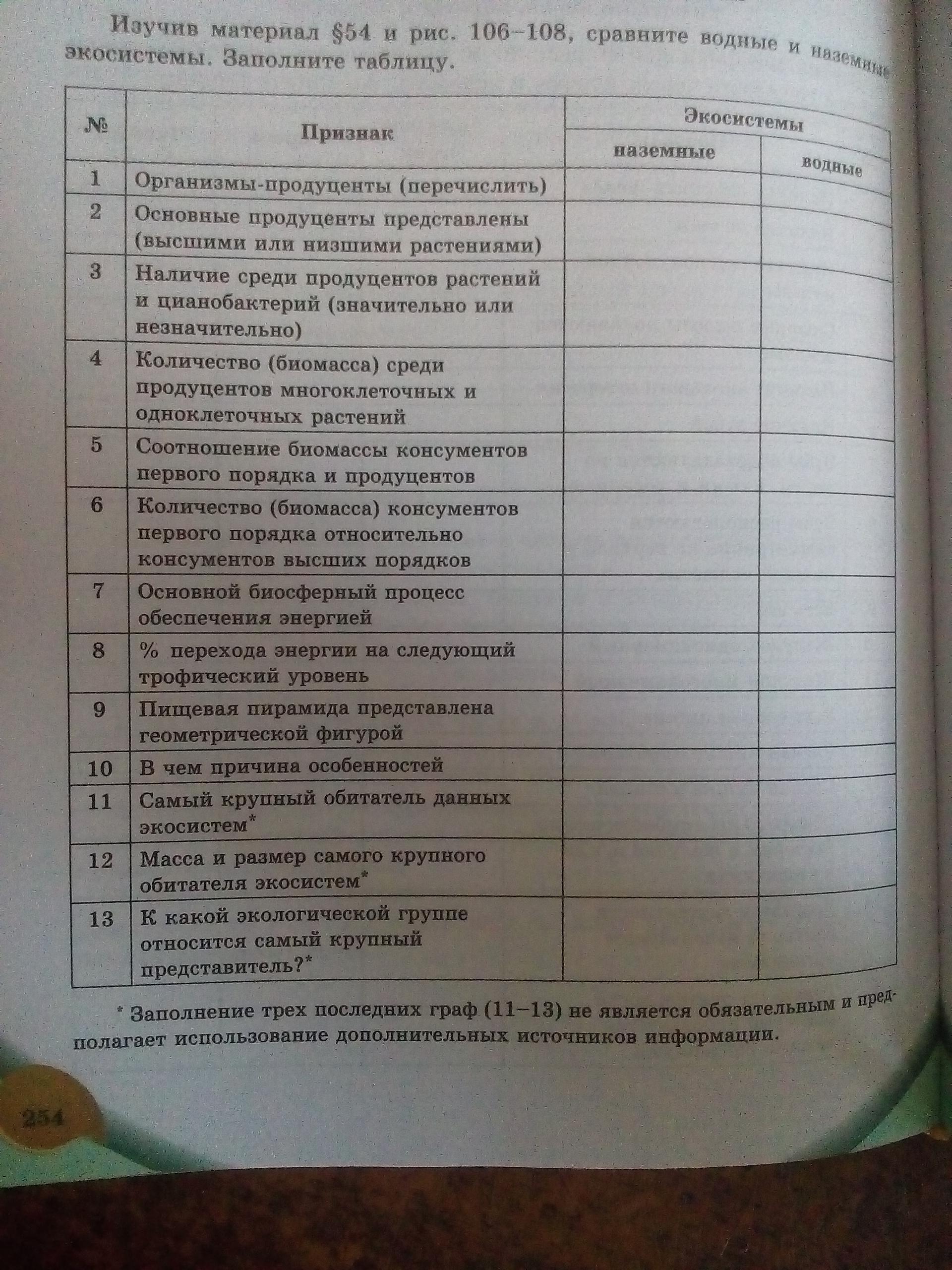 изучив материал параграфа 54 и рисунок 106 108 Сравните водный и наземные экосистемы и заполните таблицу