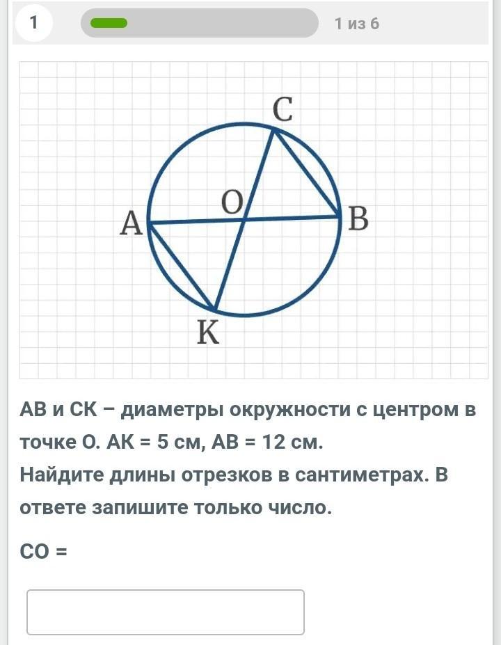 АВ и СК – диаметры окружности с центром в точке О. АК = 5 см, АВ = 12 см.