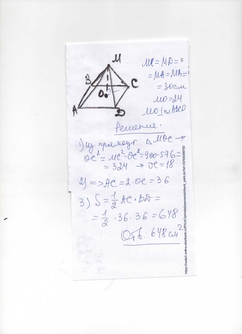 ПЖ ♥♥♥Точка М равноудалена от вершин квадрата АВСД на расстоянии 30 см. Найдите площадь квадрата, если расстояние от точки М до плоскости квадрата равно 24см.