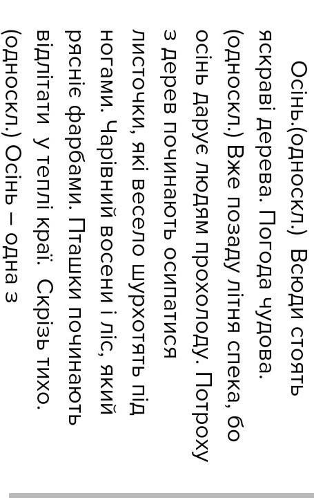 Осінь. Всюди стоять яскраві дерева. Погода чудова. Вже позаду літня спека, бо осінь дарує людям прохолоду. Потроху з дерев починають осипатися листочки, які весело шурхотять під ногами. Чарівний восени і ліс, який рясніє фарбами. Пташки починають відлітати у теплі краї. Скрізь тихо. Осінь – одна з найпрекрасніших пір року. Любіть осінь!