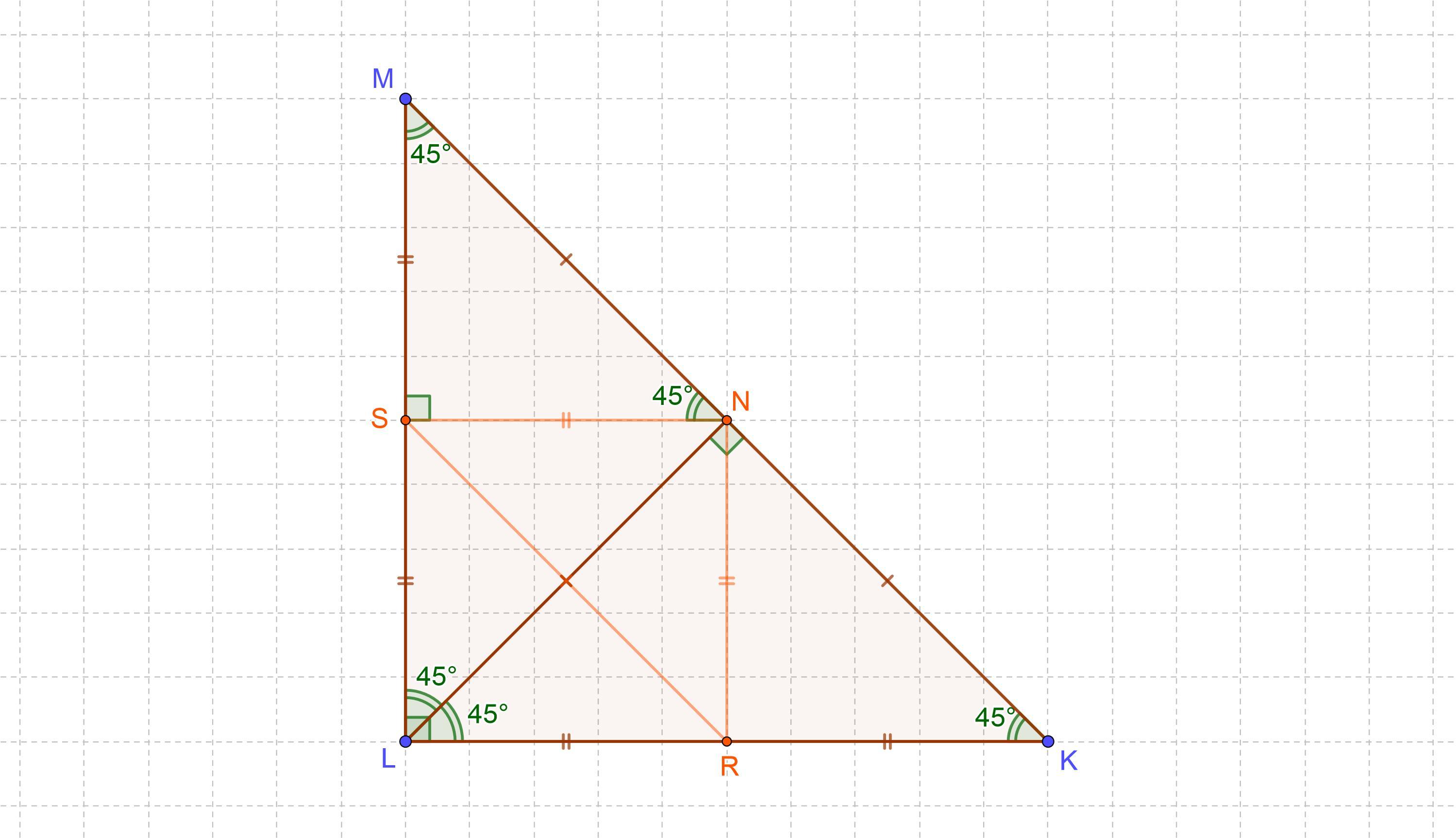 ∠NLM = ∠NLK = 90/2 = 45° (т.к. LN — биссектриса) ⇒ Δ NML и ΔNLK — равнобедренные. Отрезки NS NR — высоты, биссектрисы и медианы Δ NML и ΔNLK соответственно ⇒