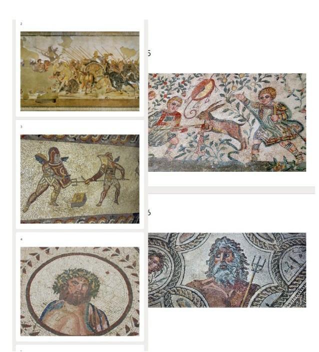 Большинство этих мозаек было создано для религиозных обрядов и для соответвующих мест ( 2,4,5) 3 ее это битва в анфитеатре, а первое это битва парфянских и македонских войск.