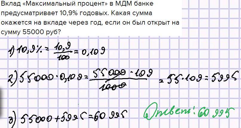 Вклад «Максимальный процент» в МДМ банке предусматривает 10,9% годовых. Какая сумма окажется на вкладе через год, если он был открыт на сумму 55000 руб?