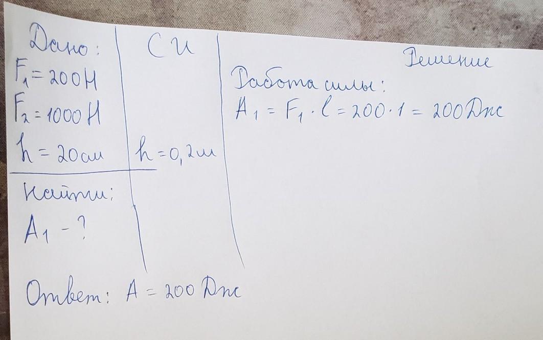 Пожалуйста помогите! Определите работу, совершенную силой F=200 Н, прикладываемой человеком, если сила P=1000 Н и левый конец рычага переместился на расстояние h2=20 см