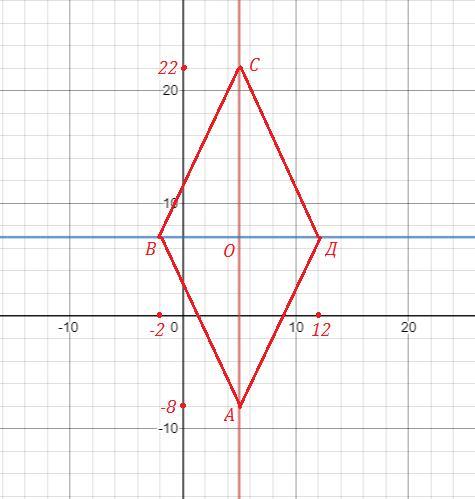 Осями симметрии ромба являются его диагонали, которые пересекаются под прямым углом. Диагонали заданного ромба пересекаются в точке O(5;7) .