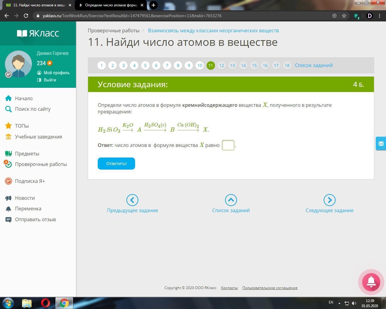 Определи число атомов в формуле кремнийсодержащего вещества X, полученного в результате превращения: