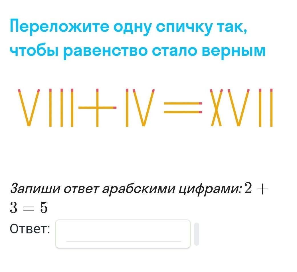 Переложить одну спичку так чтобы равенство стало верным запишите ответ арабскими цифрами 2 +3=5