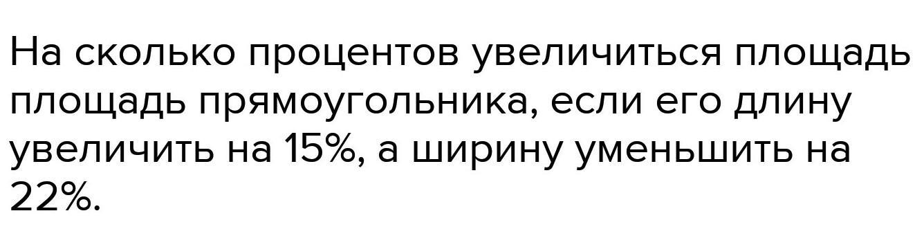 Если мы длину увеличиваем на 15%, то она составляет 1,15а. Ширина, увеличенная а 20%, будет равна 1,2b. Получаем прямоугольник площадью S2=1,15a * 1,2*b =1,38ab