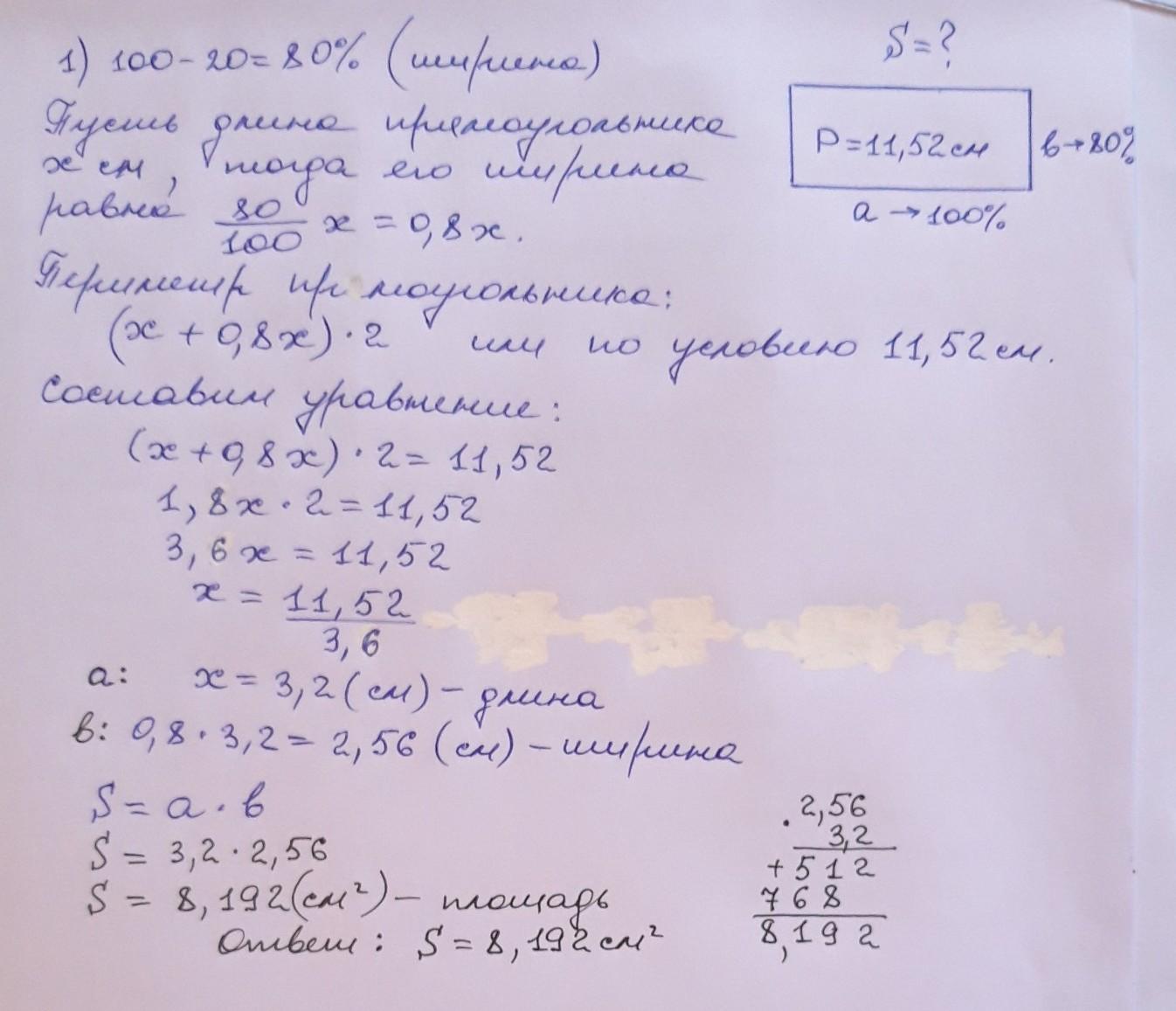 ширина прямоугольника на 20% меньше длины а его периметр равен 11,52 см. Найжите площадь прямоугольника выразиье эту площадь в дм²