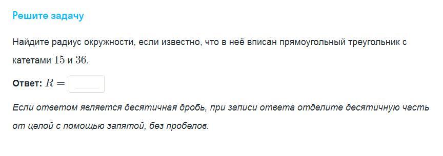 Центром описанной около прямоугольного треугольника окружности является середина гипотенузы, найдем ее: