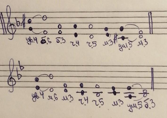 В ре миноре (гарм. вид.) и в Си бемоль мажоре построить и петь последовательность интервалов: ув4 на ст. Ⅳ, м6 на Ⅲ, м3 на Ⅲ, ч4 на Ⅱ, ч5 на Ⅰ , м3 на Ⅱ, ум5 на Ⅶ, б3 на Ⅰ