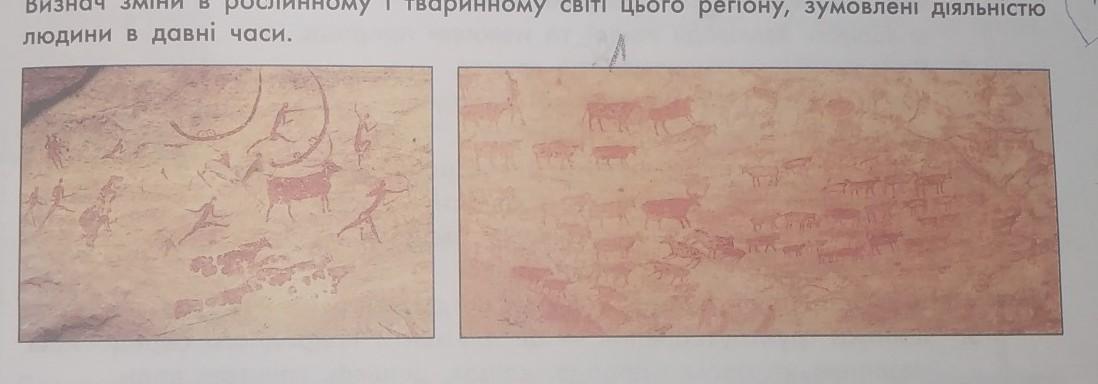Розглянь фото на скельних малюнків ( плато Тассилін-Аджер у пустелі Сахара). Визнач зміни в рослинному і тваринному світі цього регіону, зумовлені діяльністю людини в давні часи.