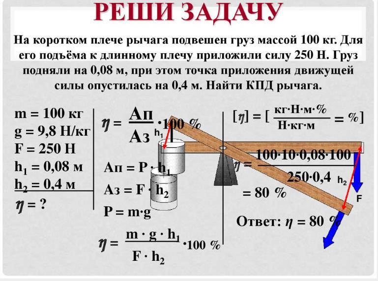КПД=Ап/Аз *100%, полезная работа Ап=m*g*h=100кг*10H/кг*0,08м=80Дж, вся совершенная