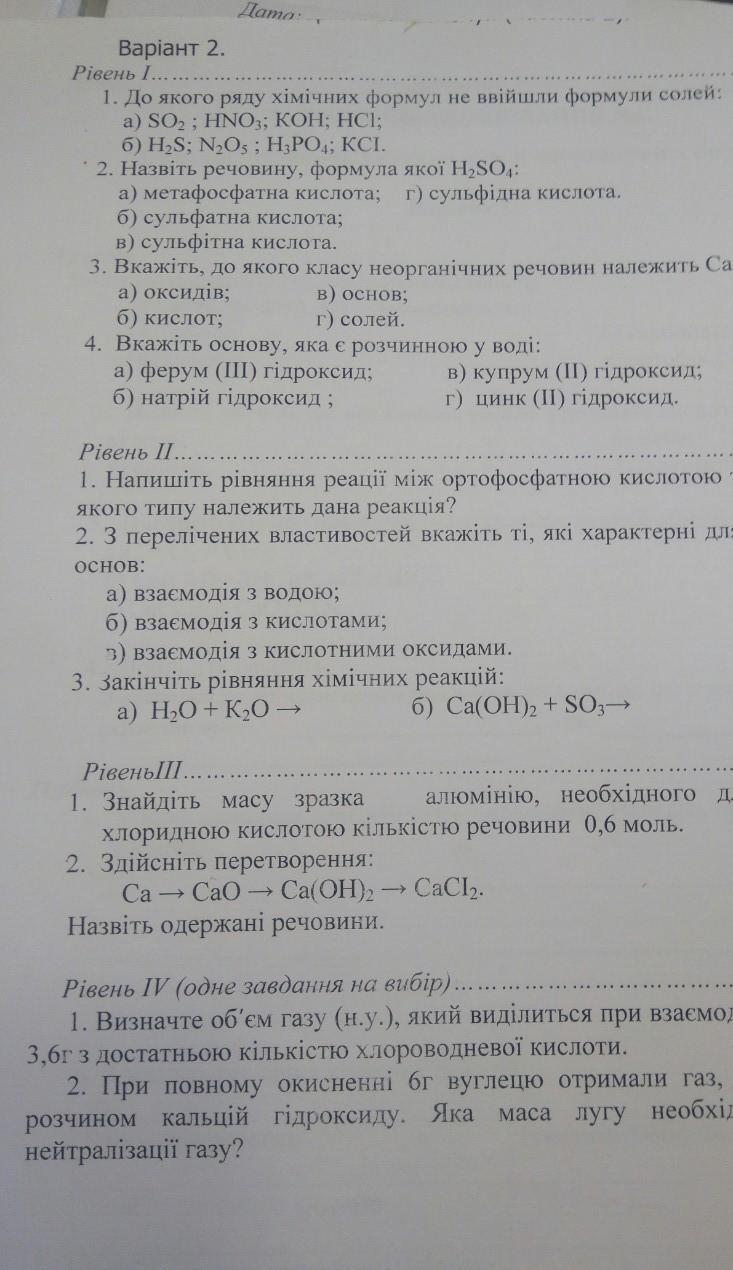 Контрольна робота по темі "ОСНОВНІ КЛАСИ НЕОРГАНІЧНИХ РЕЧОВИН" 8 клас 2 веріант​