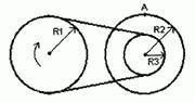 Два диска пов'язанi мiж собою шкiвом. Лiвий диск крутиться з кутовою швидкістю w(омега). Визначити лiнiйну швидкiсть точки А правого диска.