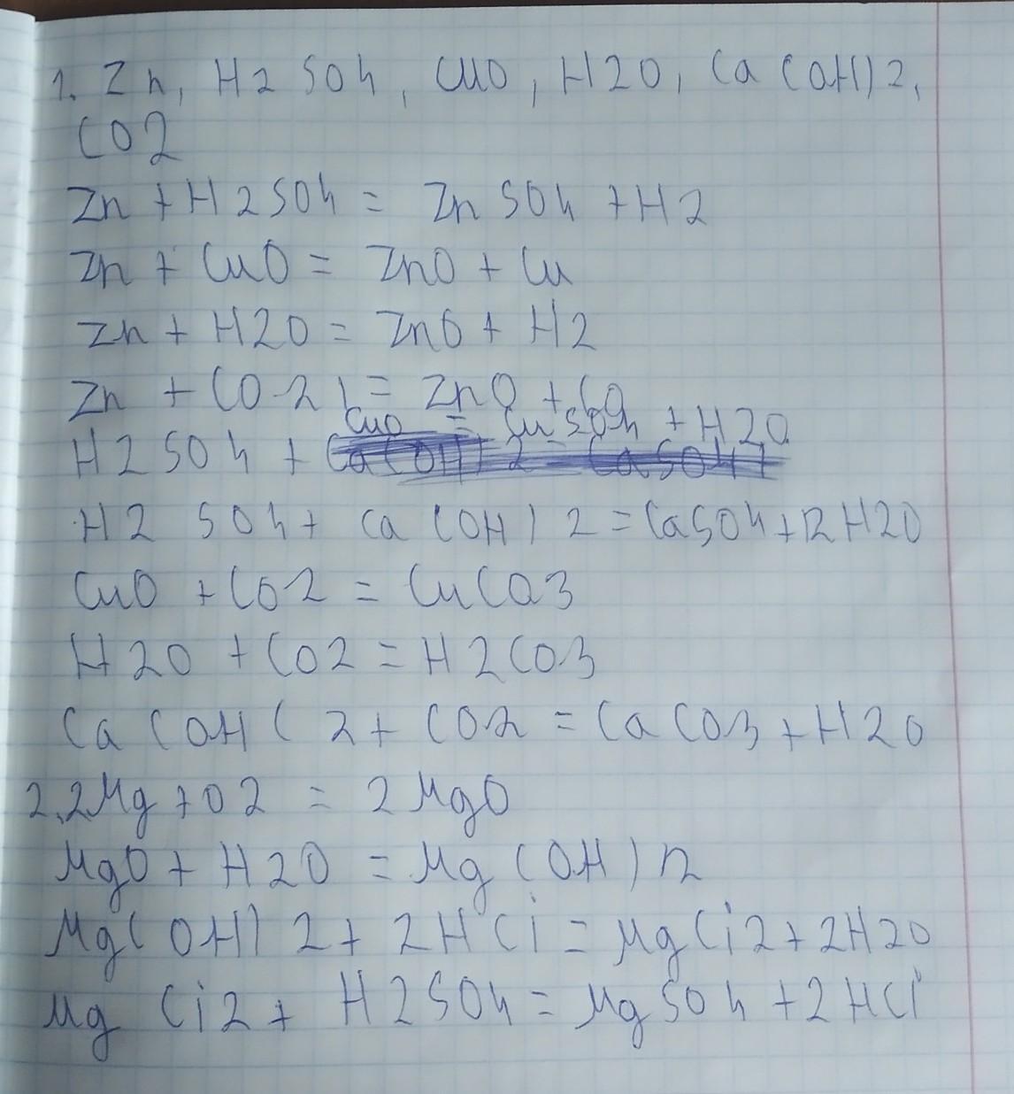 1. Zn, H2SO4, CuO, H2O, Ca(OH)2, CO2