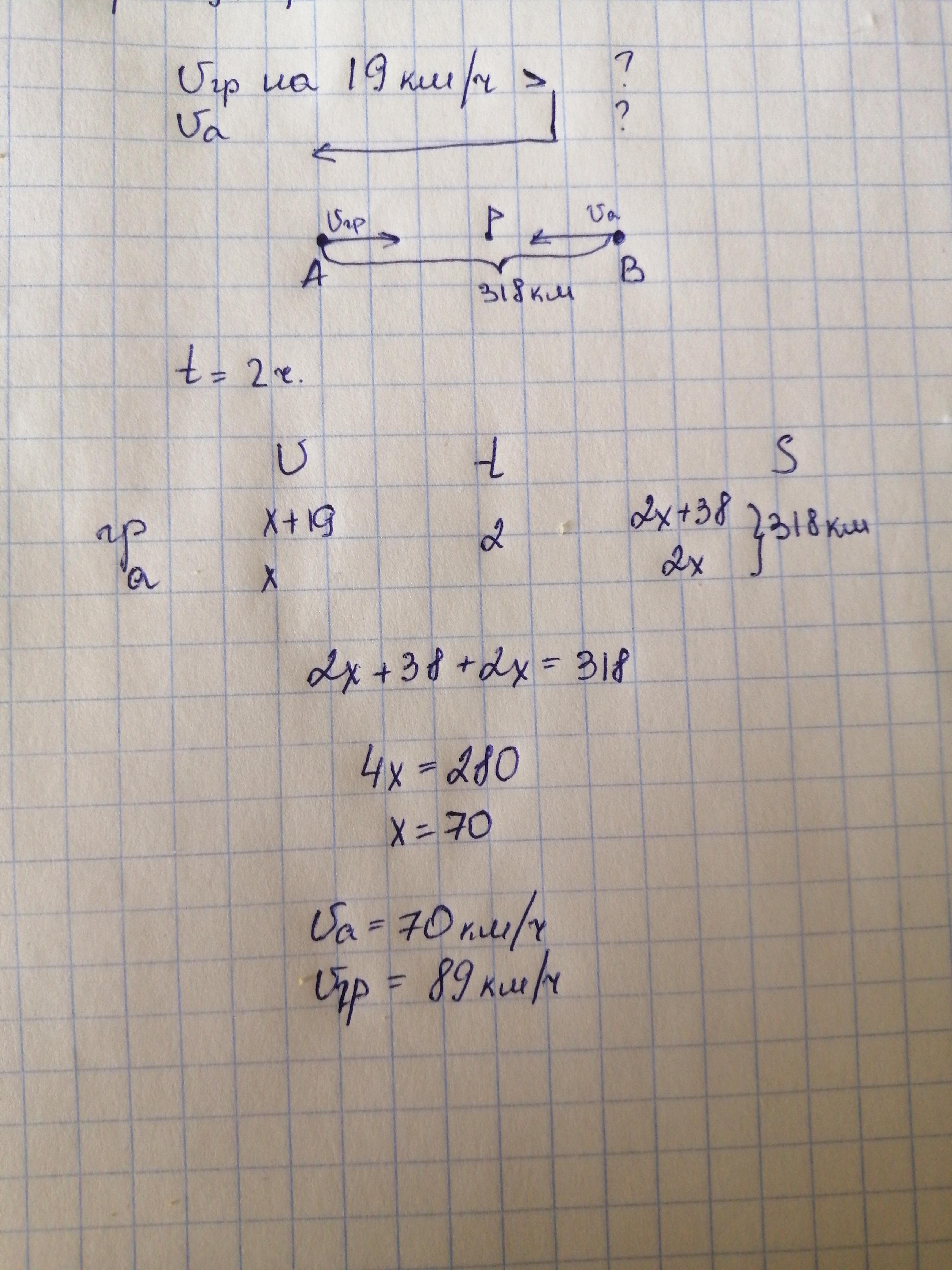 Автобус и грузовая машина, скорость которой на 19 км/ч больше скорости автобуса, выехали одновременно навстречу друг другу из двух городов, расстояние между которыми — 318 км. Определи скорости автобуса и грузовой машины, если известно, что они встретились через 2 ч. после выезда.
