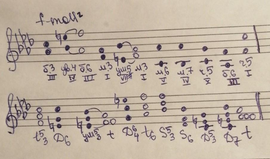 Построить в f-moll (г.) интервальную последовательность 3 на III , 4 на IV с разреш., 3 на I , 5 на VII с разреш., 6 на V, 7 на IV , 5 на V , 6 на III , 5 на I ; аккордовую последовательность - t53 - D6 - Ум53 с разреш. - D64 - t6 - s53 - s6 - D53 - D7 с разреш.
