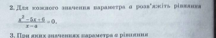 x-a≠0 x≠a -5x+6=0 по теоремi Вiэта х1=2 х2=3, отже a≠2 a≠3 тому що на 0дiлити не можна. при всiх iших значеннях а, крiм 2 i 3 х1=2 х2=3