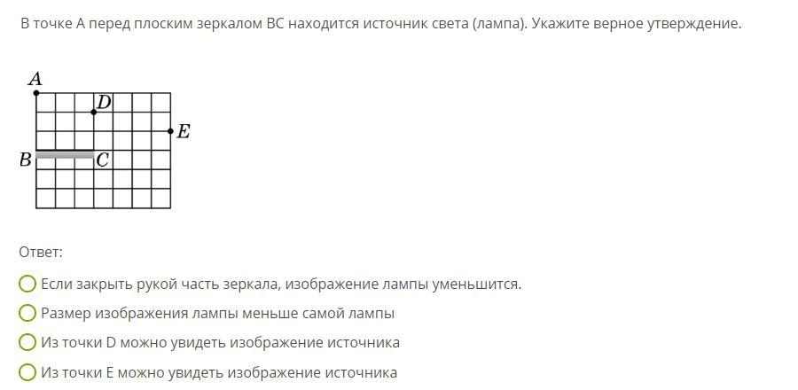 В точке А перед плоским зеркалом ВС находится источник света (лампа). Укажите верное утверждение.