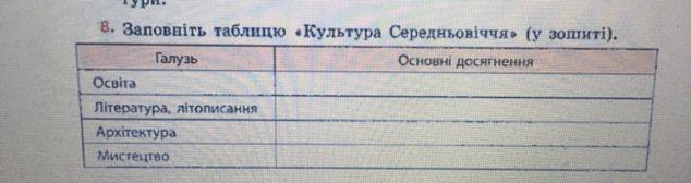 Заповніть таблицю Культура середньовіччя ! Дам 100 балів ! Заповніть у зошиті таблицю по фото ! Без дурниць !