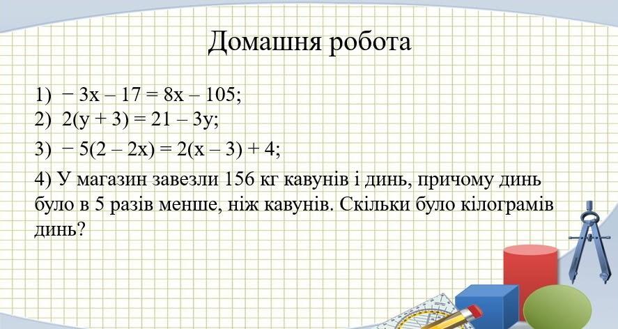 4)Пусть дынь было х кг,тогда арбузов было 5х кг.Составим уравнение.