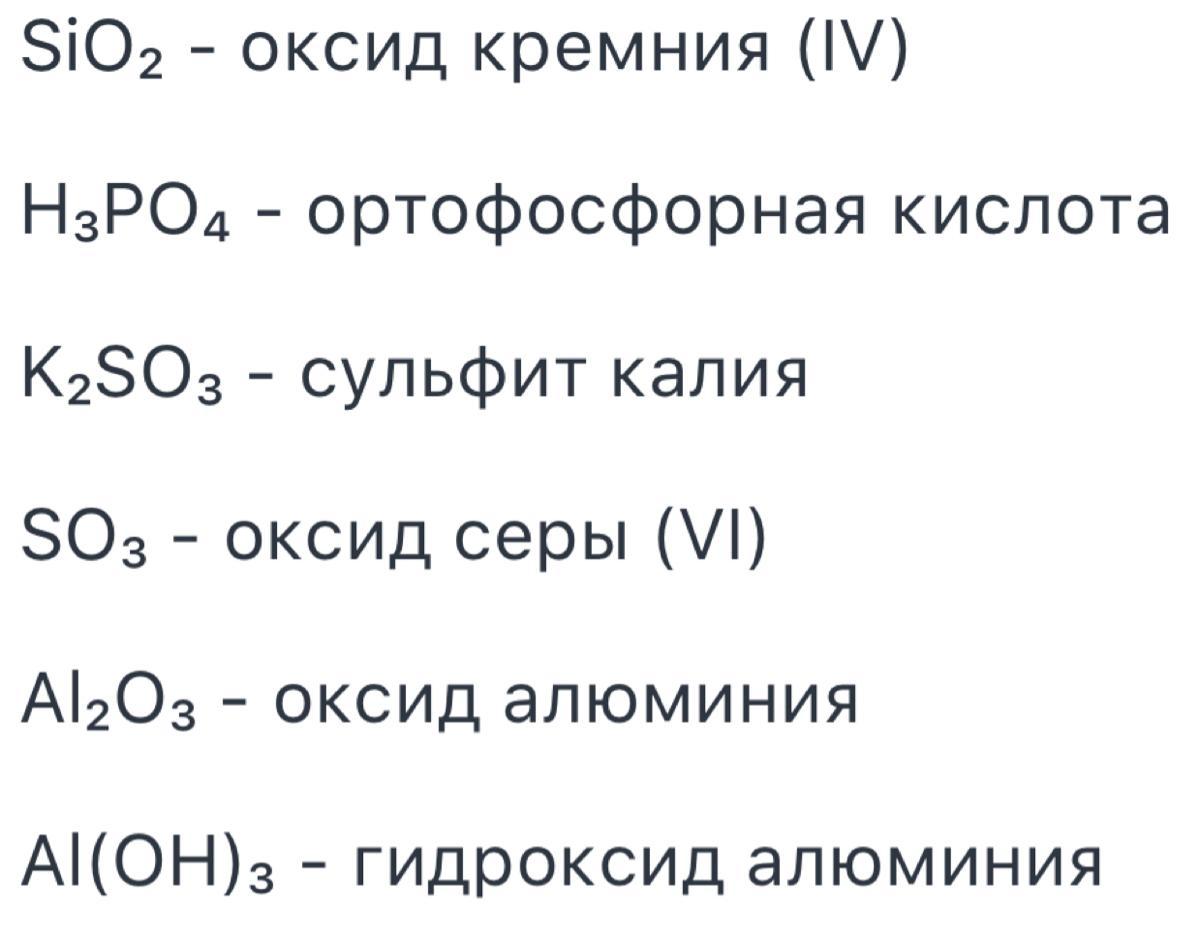 3 переліку сполук виписати оксиди та дати їм відповідні назви: SiO 2 , Н 3 РO 4 , К 2 SO 3 , SO 3 , АІ 2 O 3 , АІ(ОН) 3