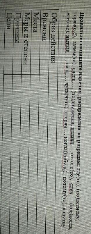 Где-то (места), по летнему (образ действия), горячо (образ действия), зачем-то (цели), слегка ( образ действия), по дружески ( образ действия), издавна ( времени), оттого-то (причины), слева ( места), кое-когда (времени ), еле-еле ( образ действия ), направо (места), назло ( цели), чуть-чуть (образ действия), сгоряча ( образ действия), когда-нибудь (времени), потому что (причины), в шутку (цели)