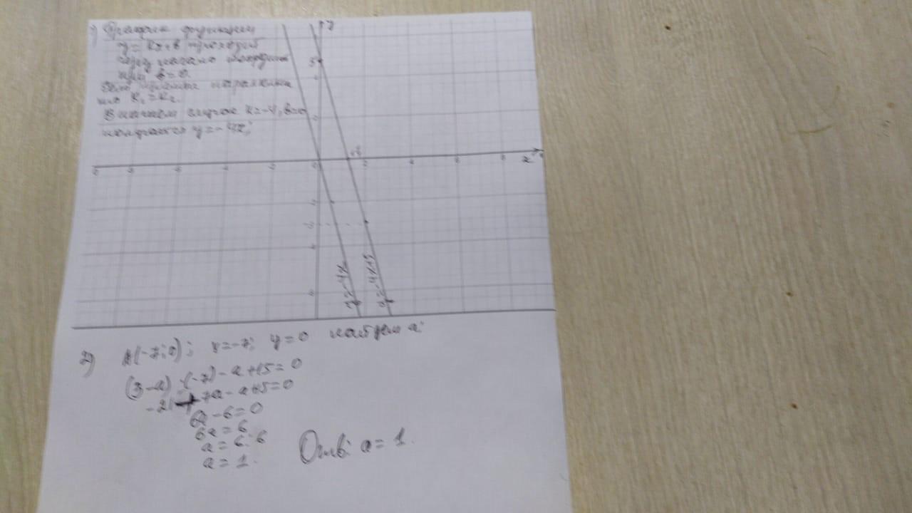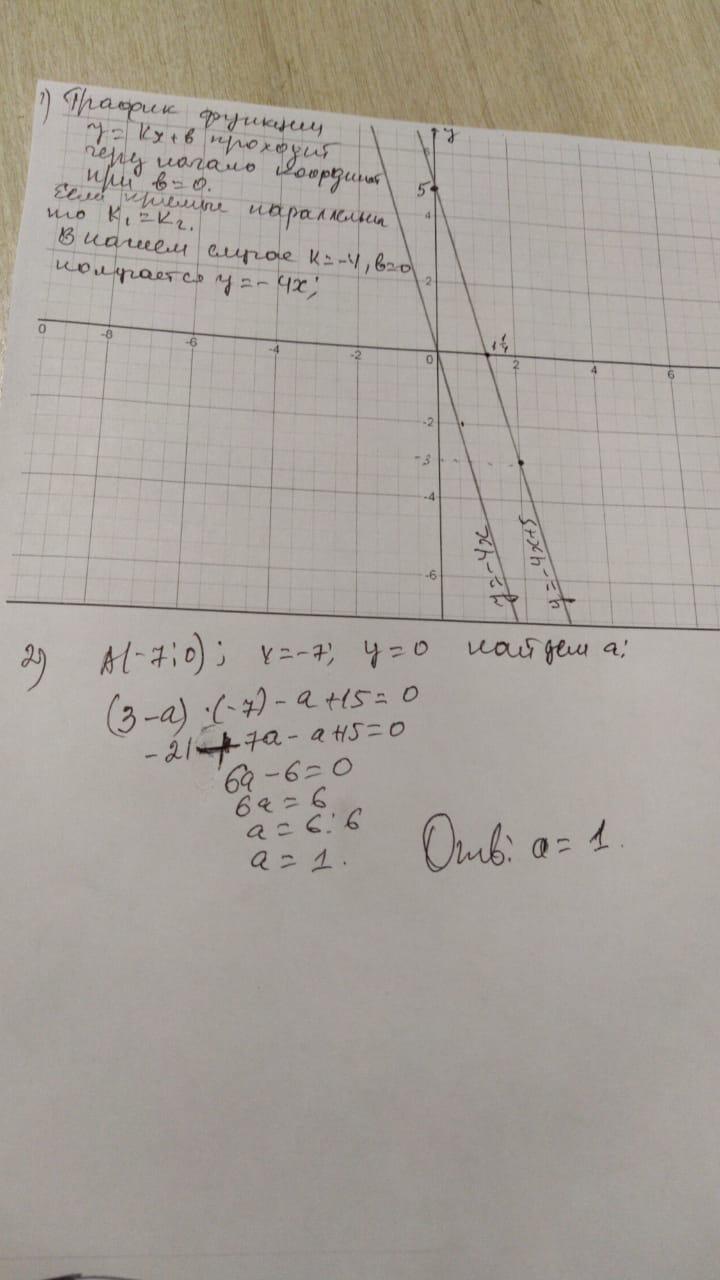 Задача: График функции y = (3−a)x−a+15 проходит через точку А(−7; 0). Найти значение а.