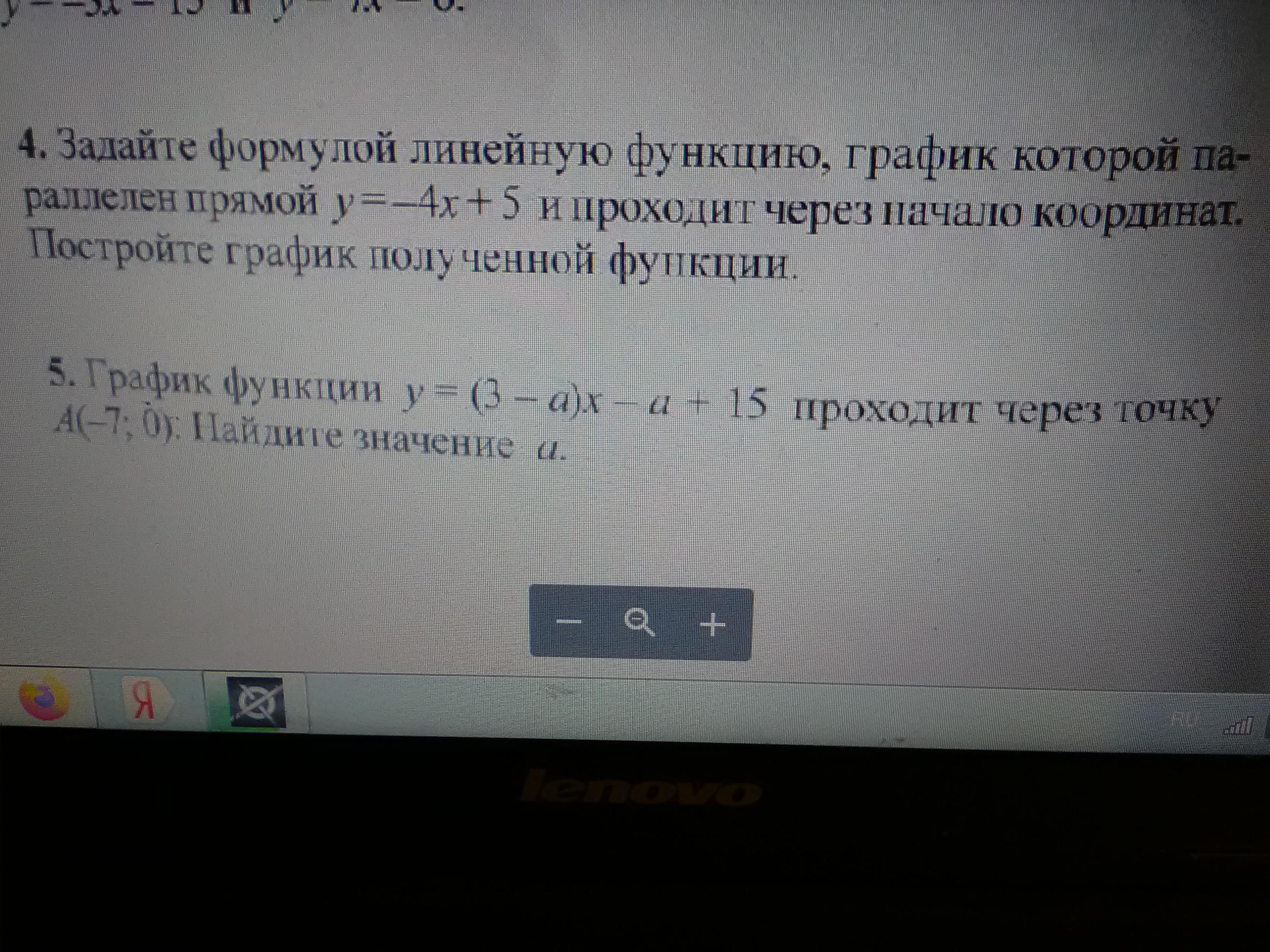 Задача: Задать формулой линейную функцию, график которой параллелен прямой y = −4x+5 и проходит через начало координат. Построить график полученной функции.