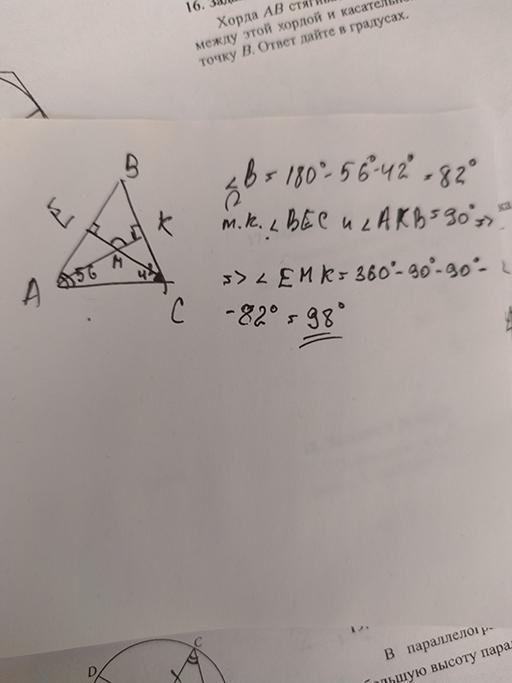 Высоты AK и CE треугольника ABC пересекаются в точке M. Найдите угол EMK, если ∠BAC = 56°, ∠BCA = 42°.