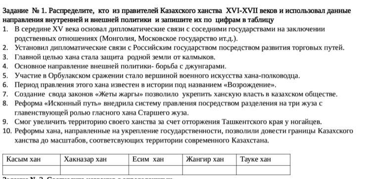 Задание № 1. Распределите, кто из правителей Казахского ханства XVI-XVII веков и использовал данные направления внутренней и внешней политики и запишите их по цифрам в таблицу 1. 1. В середине XV века основал дипломатические связи с соседними государствами на заключении родственных отношениях (Монголия, Московское государство ит. д. ). 2. Установил дипломатические связи с Российским государством посредством развития торговых путей. 3. 3. Главной целью хана стала защита родной земли от калмыков. 4. Основное направление внешней политики- борьба с джунгарами. 5. Участие в Орбулакское сражении стало вершиной военного искусства хана-полководца. 6. Период правления этого хана известен в истории под названием «Возрождение». 7. Создание свода законов «Жеты жаргы» позволило укрепить ханскую власть в казахском обществе. 8. Реформа «Исконный путь» внедрила систему правляния посредством разделения на три жуза с главенствующей ролью гласного хана Старшего жуза. 9. Смог увеличить территорию своего ханства за счет отторжения Ташкентского края у ногайцев. 10. Реформы хана, направленные на укрепление государственности, позволили довести границы Казахского ханства до масштабов, соответсвующих территории современного Казахстана. Касым хан Хакназар хан Есим хан Жангир хан Тауке хан